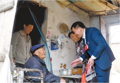 殷勇(右一)到農(nóng)戶家中走訪,為老人送去慰問品