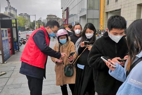 “師傅,請(qǐng)佩戴好口罩,出示身份證,間隔1米排隊(duì),謝謝配合?!薄绑w溫正常,請(qǐng)到信息登記處登記?!薄靶畔⒁训怯浐?,請(qǐng)保存好您的采樣憑證?!痹谌懈魃鐓^(qū)核酸采樣點(diǎn),隨處可見(jiàn)郵政志愿者的身影,有的在維護(hù)現(xiàn)場(chǎng)秩序,有的在查看“兩碼”、有的測(cè)量體溫,有的登記信息。