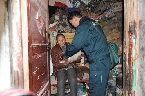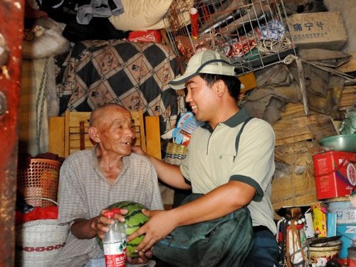 在訂戶眼中,張軍是個有名的“熱心腸”。在他負(fù)責(zé)的片區(qū)里,有一位早年喪偶的孤寡老人——邰連科,老人已經(jīng)70余歲,靠低保和撿破爛為生,雖然他不是張軍的報刊訂戶,但是看到老人孤獨的身影,一種憐憫之心油然而生。于是他就成了老人的“義務(wù)志愿者”,每天路過老人家門口,他都要停下匆匆的腳步,看一看老人的生活狀況,還自掏腰包為老人買點水果,帶點米面。每次提起張軍,老人都感動地說:“我沒有兒子,上天卻為我?guī)硪晃挥H人?!边@件事,張軍已經(jīng)做了2年,他用自己的愛心鋪就了一條特殊的郵路。
