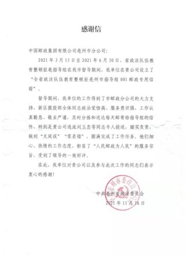 今年8月份,亳州市分公司還收到了來自中國石油天然氣股份有限公司安徽亳州銷售分公司的感謝信,感謝亳州市分公司在安徽銷售分公司巡察期間提供的高質(zhì)量郵政服務(wù)。