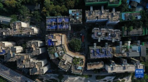 這是重慶市北碚區(qū)新房子片區(qū)老舊小區(qū)改造項(xiàng)目施工現(xiàn)場(chǎng)(2021年10月23日攝,無人機(jī)照片)。新華社發(fā)(秦廷富攝)