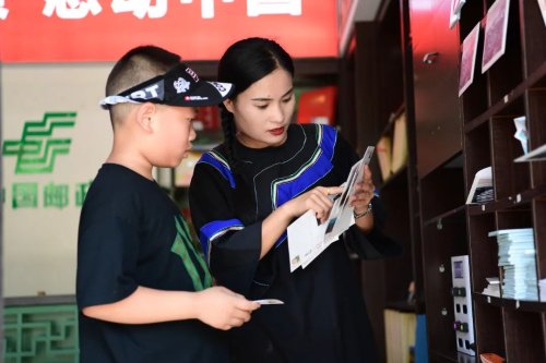 60平方米的主題郵局,擺放著各類主題郵品,游客的增多,讓負(fù)責(zé)人麻秀珍有點(diǎn)忙不過(guò)來(lái)了。“現(xiàn)在是暑期,很多學(xué)生和小朋友都會(huì)來(lái)這里參觀游玩,我會(huì)主動(dòng)給他們介紹明信片和郵品上關(guān)于十八洞村的故事,很多人都對(duì)這些感興趣,會(huì)買一份紀(jì)念郵品帶回去給自己的同學(xué)、朋友,很有紀(jì)念意義。”她說(shuō)。一位小朋友站在柜臺(tái)前對(duì)比了幾款明信片后,選擇了一套《苗鄉(xiāng)十八洞》的明信片,還讓麻秀珍給他的每一張明信片都蓋上郵戳。