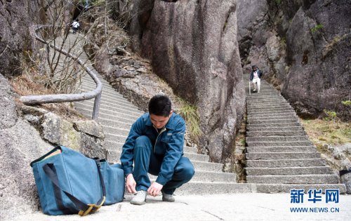 3月16日,休息間隙,謝菲俊放下郵包,一邊擦汗一邊欣賞黃山美景。