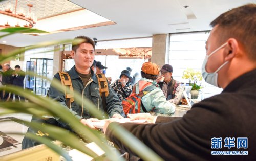 3月16日,黃山風(fēng)景區(qū)內(nèi),謝菲俊背著郵包仰望山頂。