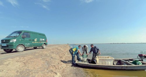 無棣埕口郵政支局投遞員王海進(jìn)在投遞途中幫客戶倒網(wǎng)收蝦。
