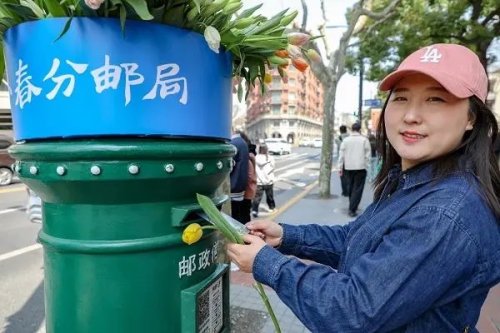 活動現(xiàn)場不僅設置有“明信片墻”,更是將綠色郵筒打造成了春意滿滿的“郁金香花筒”,一時間吸引了眾多市民、游客打卡拍照,大家進入郵局后領取明信片書寫、貼郵票、蓋紀念戳、郵寄,用這種方式共同傳遞上海春日的美好。