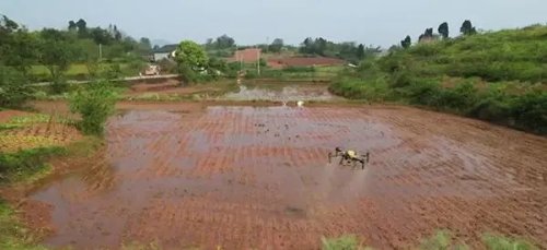 植保無人機(jī)撒下秧田除草劑。郵儲銀行重慶分行供圖
