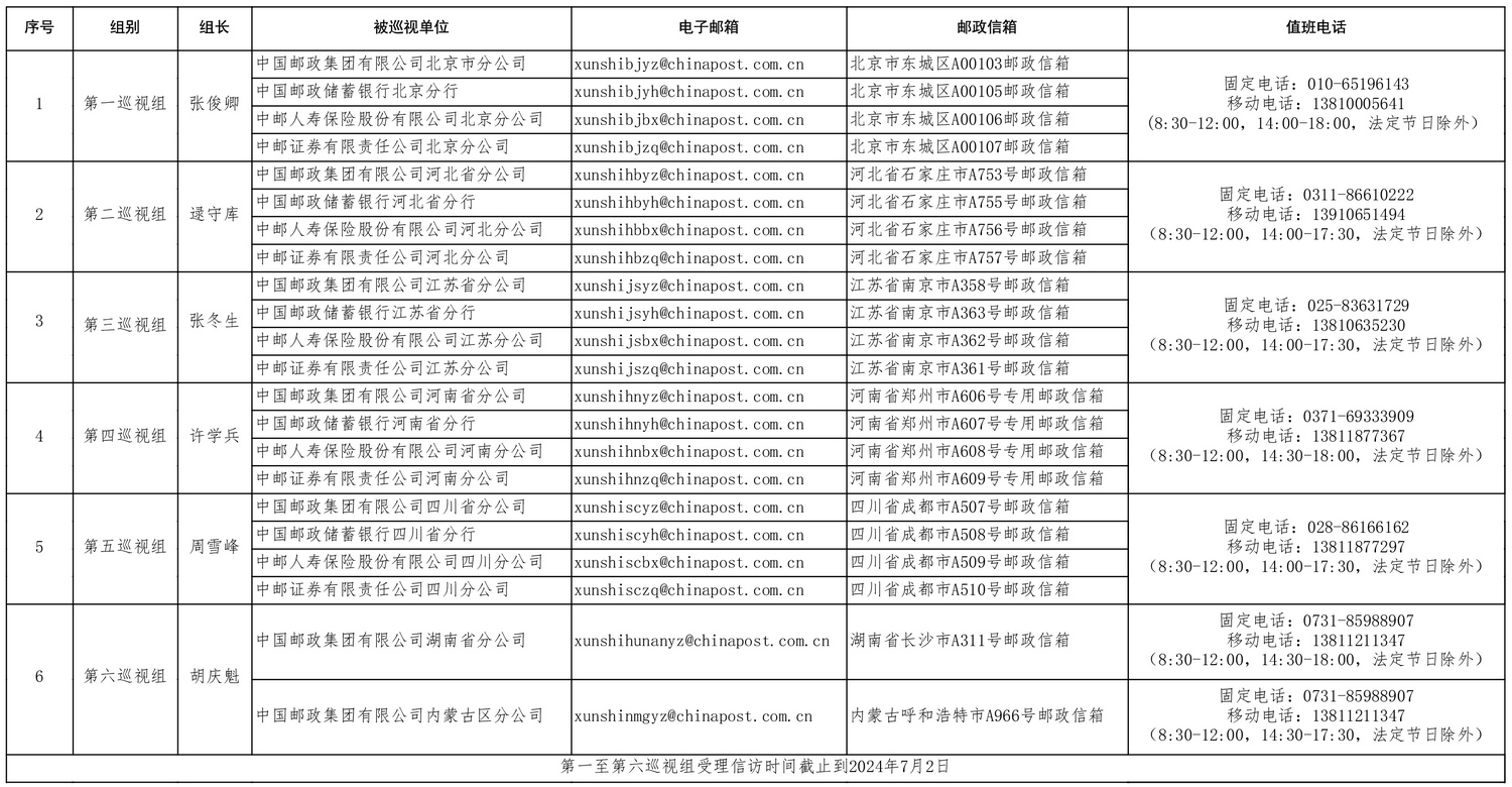 中國郵政集團有限公司黨組2024年第一批巡視進駐信息一覽表