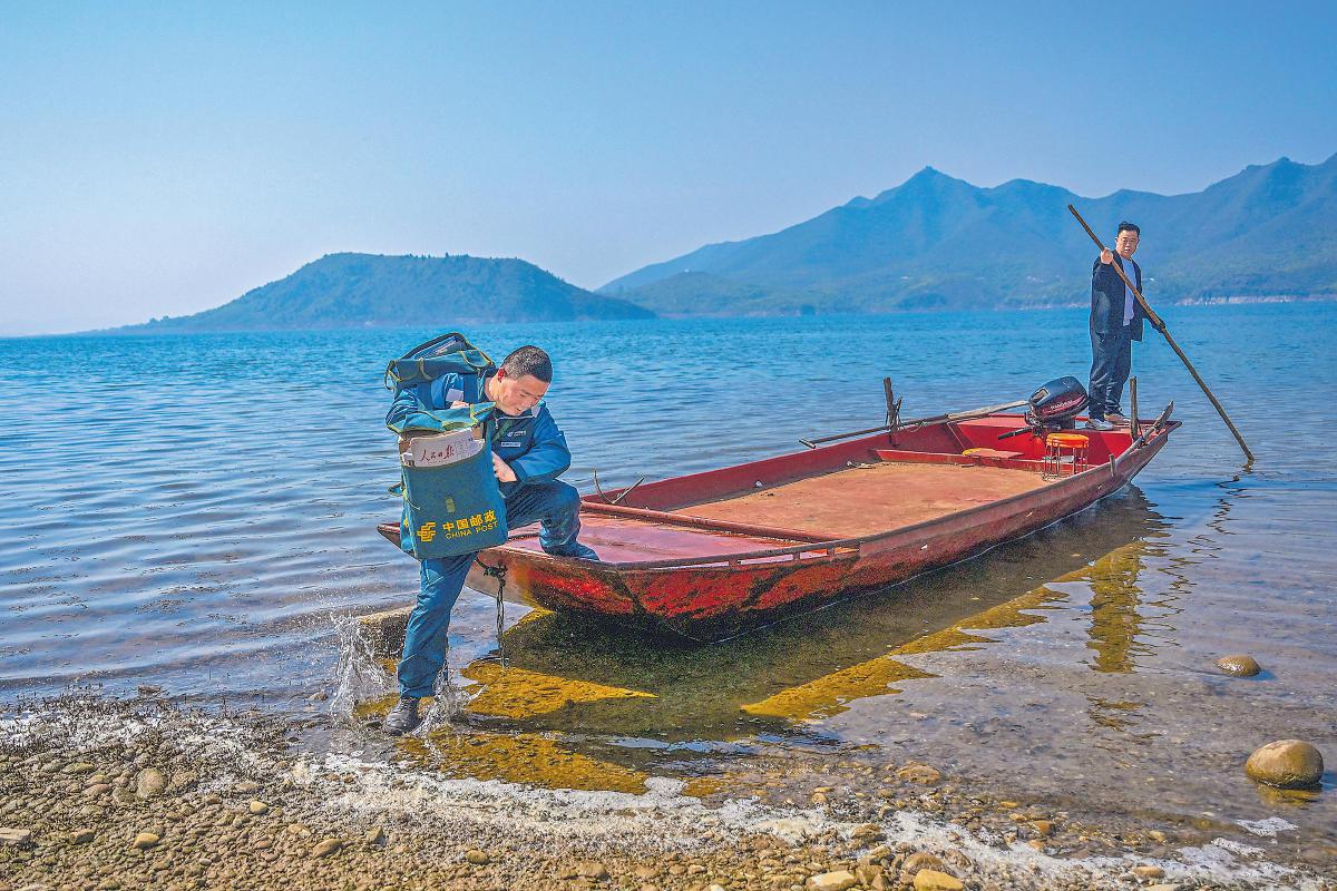 綠色摩托車、綠色郵包、絳紅色渡船、碧波蕩漾的水面和遠(yuǎn)處如黛的群山,石新國(guó)穿行其間,如同置身一幅青山綠水的秀美畫卷?!斑@條郵路我已經(jīng)走了20多年,只要鄉(xiāng)親們需要,我會(huì)一直走下去?!笔聡?guó)堅(jiān)定地說(shuō)。