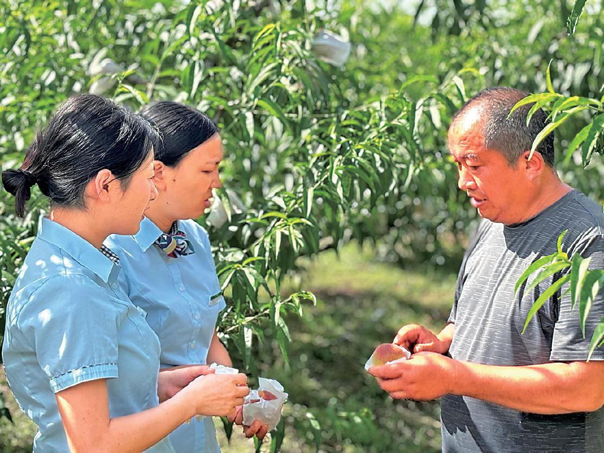 郵政工作人員在郭家村果園了解農(nóng)品情況,并向農(nóng)戶介紹郵樂平臺。 □宋貞穎 攝