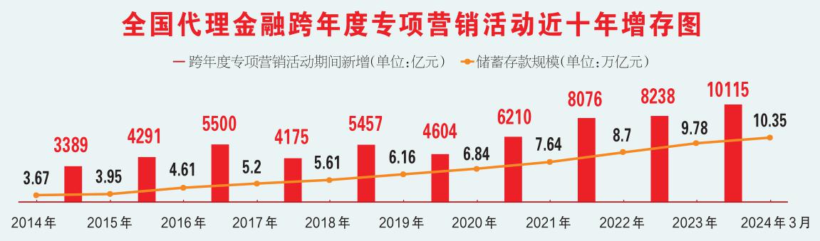 目前,全國郵政代理金融(2023—2024)跨年度專項(xiàng)營銷活動已圓滿結(jié)束,各級機(jī)構(gòu)內(nèi)外兼修強(qiáng)服務(wù)、客戶至上增價(jià)值、拓客增存增收,取得了顯著成效?;顒悠陂g,儲蓄存款新增10115億元,其中,價(jià)值存款新增10254億元,價(jià)值存款新增占比為101.4%;代發(fā)單位新增25448戶,代發(fā)金額達(dá)4072億元。截至2024年3月末,全國郵政代理金融儲蓄存款規(guī)模達(dá)103529億元。跨年度專項(xiàng)營銷活動成為全國郵政代理金融儲蓄存款高位爬坡的“主引擎”,近10次跨年度專項(xiàng)營銷活動累計(jì)新增儲蓄存款59234億元,今年2月,儲蓄存款規(guī)模邁上10萬億元?dú)v史性新臺階。