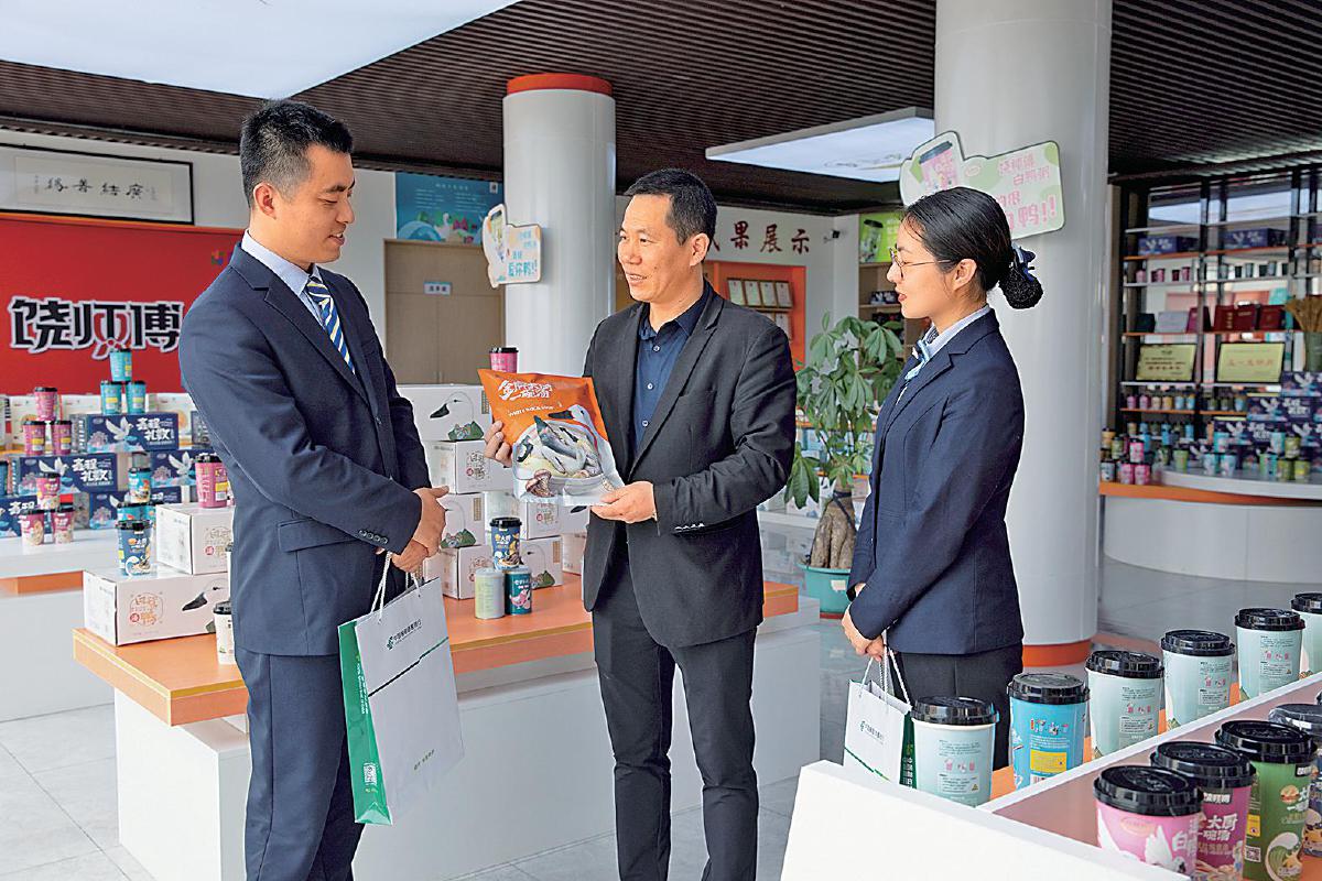 饒鑫程向郵儲信貸員介紹白鴨“金牌大廚一碗湯”產品。