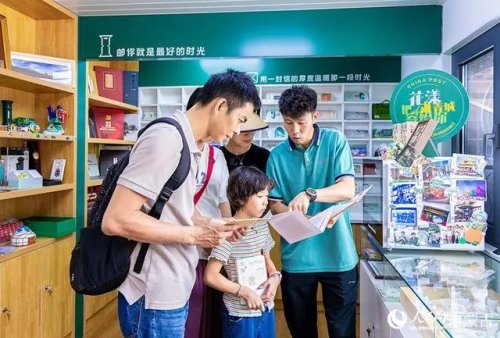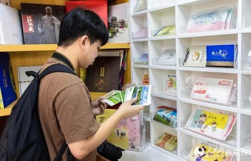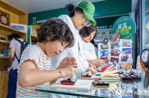 6月18日,來自福建的游客在呼和浩特市玉泉區(qū)塞上老街旅游休閑街區(qū)“塞上主題郵局”內(nèi)參觀、選購。