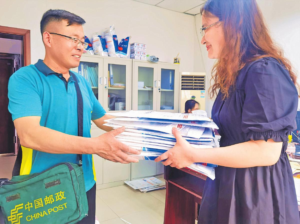 圖為7月11日,該分公司投遞員將當(dāng)日進(jìn)口的高校畢業(yè)生檔案投遞到縣人力資源和社會(huì)保障局人事檔案室,與檔案室工作人員做好交接、登記手續(xù)。