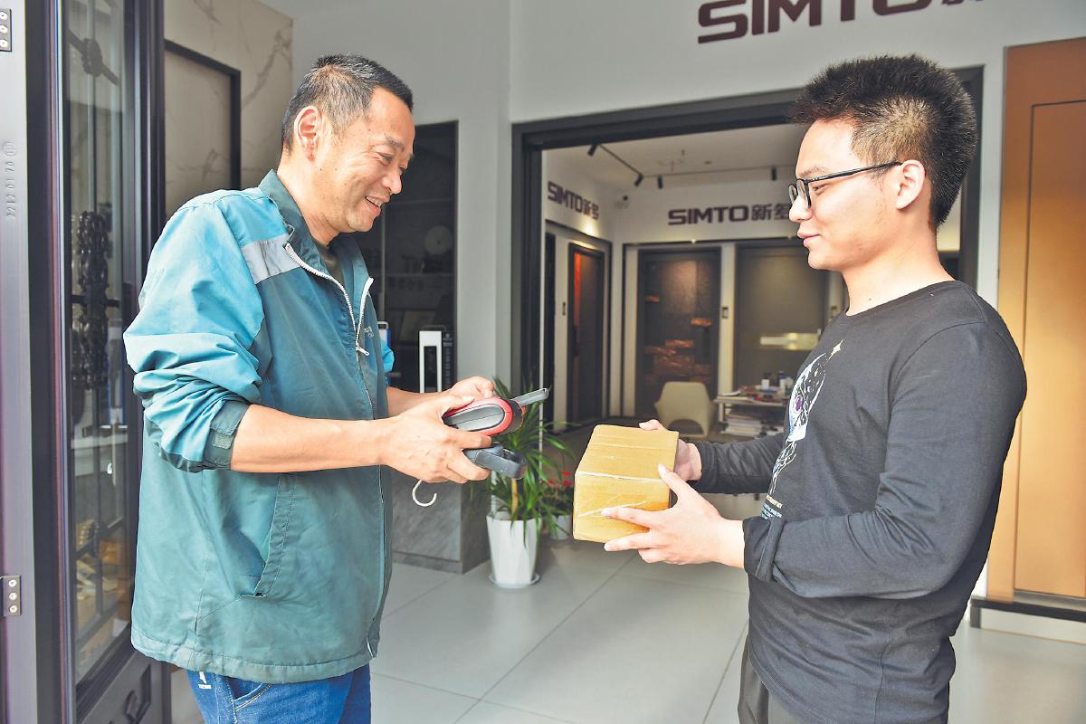 江蘇省南通市海門(mén)區(qū)郵政分公司員工上門(mén)為客戶(hù)提供退換貨寄遞服務(wù)?! 跬鯕g 攝