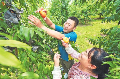 郵政員工與桃農(nóng)一起采摘鮮桃,共享豐收的喜悅。□萬宇 攝