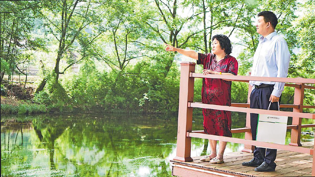 客戶經(jīng)理與查金花(左)在水墨汀溪邊交談?! 趵煽 z