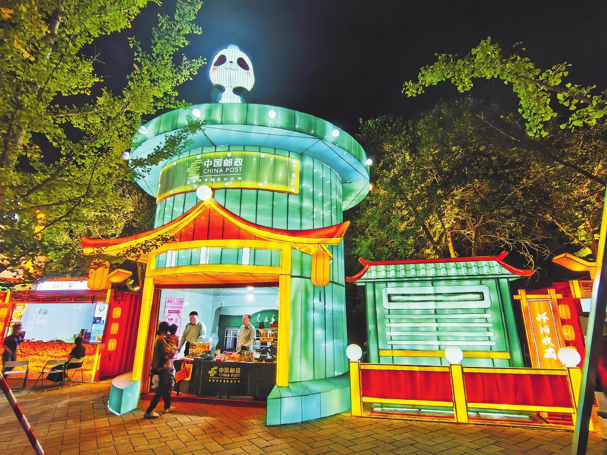 9月14日,北京首屆“京彩燈會”——園博園中秋國慶彩燈游園會盛大開幕。此次燈會規(guī)模宏大,是四川自貢燈會在北京的再度精彩呈現(xiàn),為廣大游客帶來了一場融合傳統(tǒng)文化與現(xiàn)代創(chuàng)意的視覺盛宴。燈會上,一組藍綠色調(diào)的郵筒花燈格外引人注目。這組花燈具有濃厚的中式建筑風(fēng)格,展現(xiàn)了郵筒的傳統(tǒng)形象,特別是上方的熊貓設(shè)計,憨態(tài)可掬。為更好地服務(wù)“京彩燈會”,北京市豐臺區(qū)郵政分公司專門設(shè)計了園博園燈會紀念章,還推出了一系列融合郵政傳統(tǒng)文化與現(xiàn)代元素的文創(chuàng)產(chǎn)品,深受游客的青睞。
