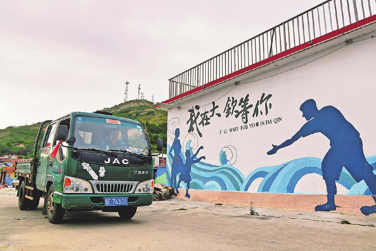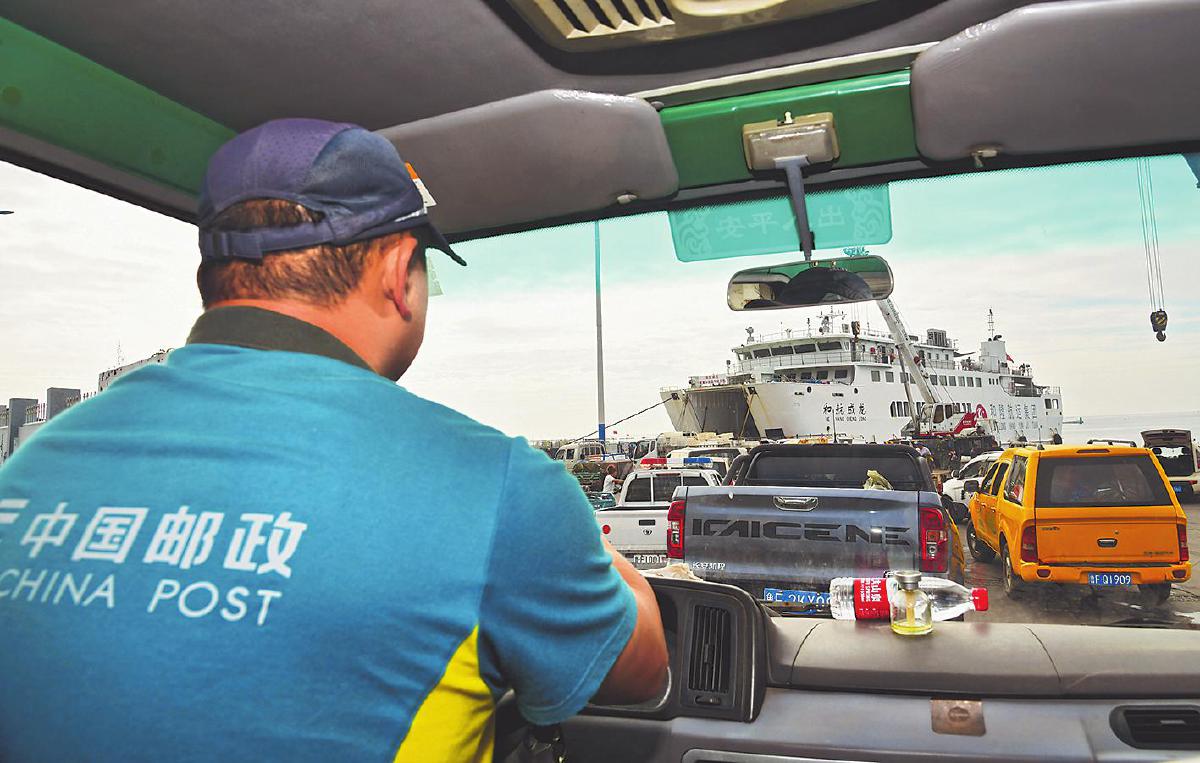 “嗚—嗚—嗚”,9月13日下午1點(diǎn),伴隨著轟隆隆的船鳴聲,長(zhǎng)約60米的白色客滾輪“和航成龍?zhí)枴本従忨傁虼髿J島碼頭。船剛一停穩(wěn),碼頭連接船艙的通道就被人流和車流分成了兩列:乘客們排著隊(duì)順著右側(cè)通道下船;在碼頭上等待已久的車輛則依次從左側(cè)上船接貨。大欽島郵政支局投遞員顧兆帥正駕駛郵車排隊(duì)等候,準(zhǔn)備接卸從蓬萊轉(zhuǎn)運(yùn)中心發(fā)來的郵件。