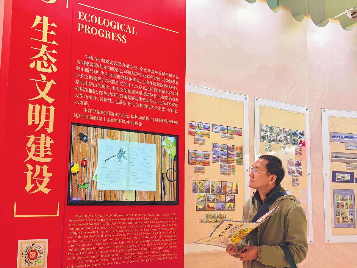 在慶祝中華人民共和國(guó)成立75周年郵票展上,新穎的電子展示方便觀眾觀展。