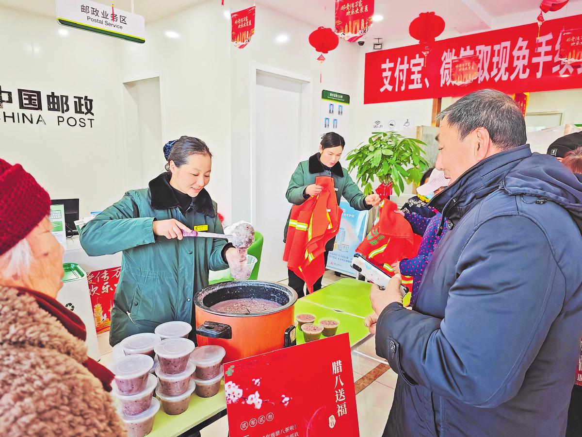 1月7日一早,江蘇省灌南縣郵政分公司九隊支局聯(lián)合當?shù)丨h(huán)衛(wèi)部門舉辦“情暖臘八,‘郵’愛你我”活動。該支局精心熬制了臘八粥,邀請新老客戶和環(huán)衛(wèi)工人免費品嘗,并為環(huán)衛(wèi)工人贈送專屬愛心馬甲,共同感受傳統(tǒng)節(jié)日的喜慶氛圍。同時,支局工作人員還現(xiàn)場講解郵政金融知識,開展反詐宣傳,增進了與客戶的交流。