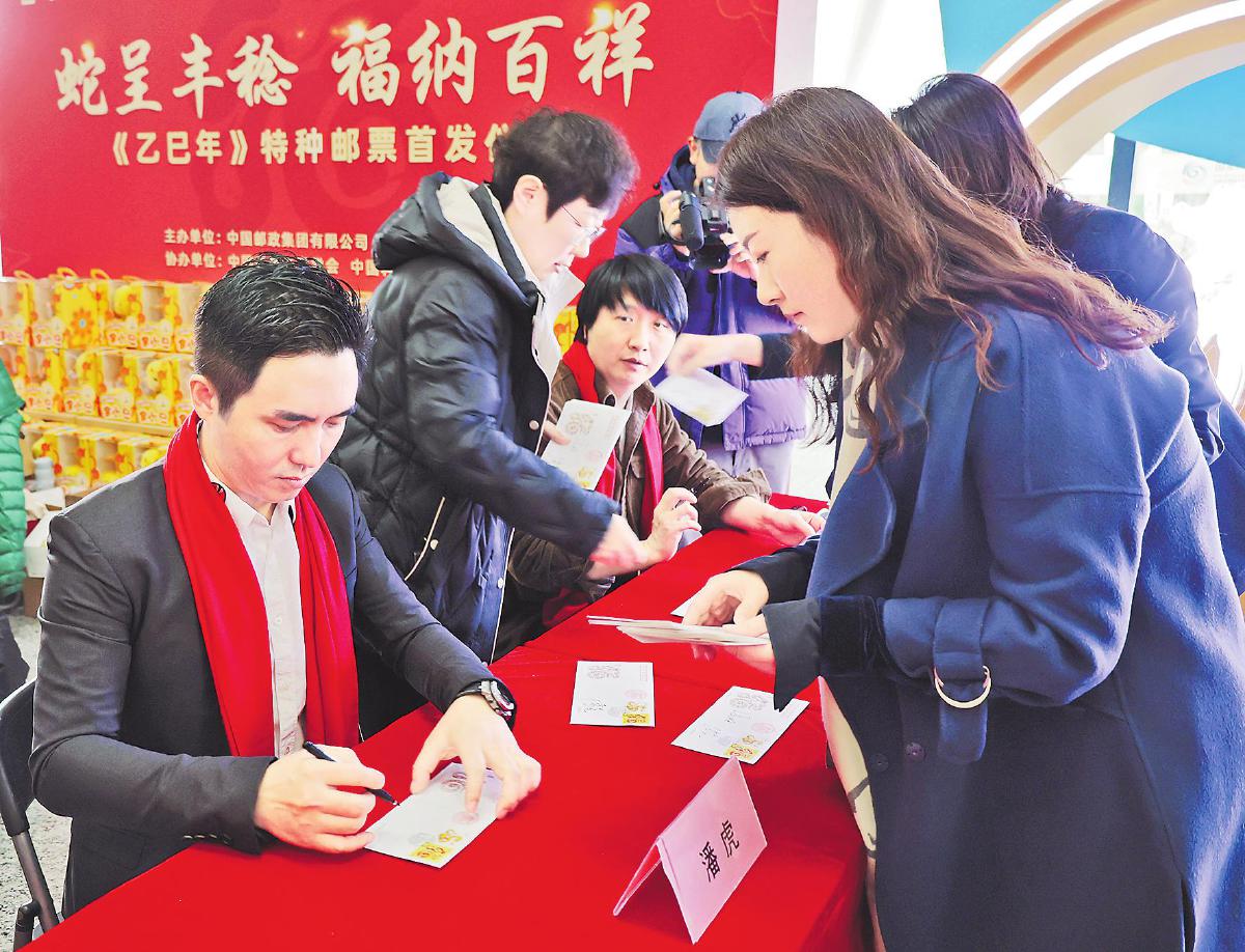 《乙巳年》特種郵票設(shè)計(jì)者潘虎、張旺在首發(fā)式現(xiàn)場簽售。□李巍 攝