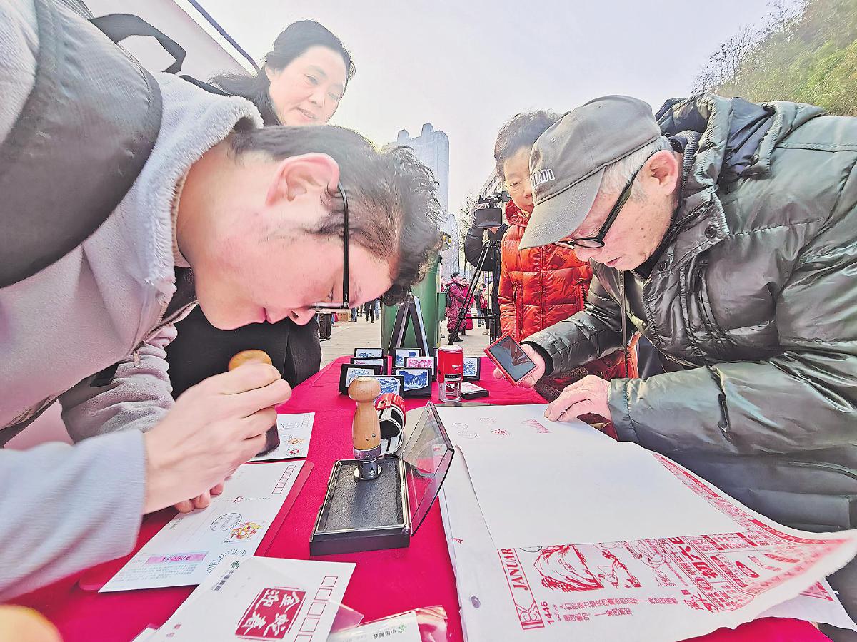 河南省南陽市郵政分公司多個(gè)網(wǎng)點(diǎn)聯(lián)動開展生肖蛇票發(fā)行活動,啟用《乙巳年》特種郵票發(fā)行紀(jì)念戳和蟒泉臨時(shí)郵局紀(jì)念戳,免費(fèi)為廣大集郵愛好者加蓋。在南陽市仲景路集郵專賣店,郵迷捧著加蓋郵戳的紀(jì)念封欲寄給親朋好友,傳遞新年祝福?!鮿⒘P(yáng) 攝