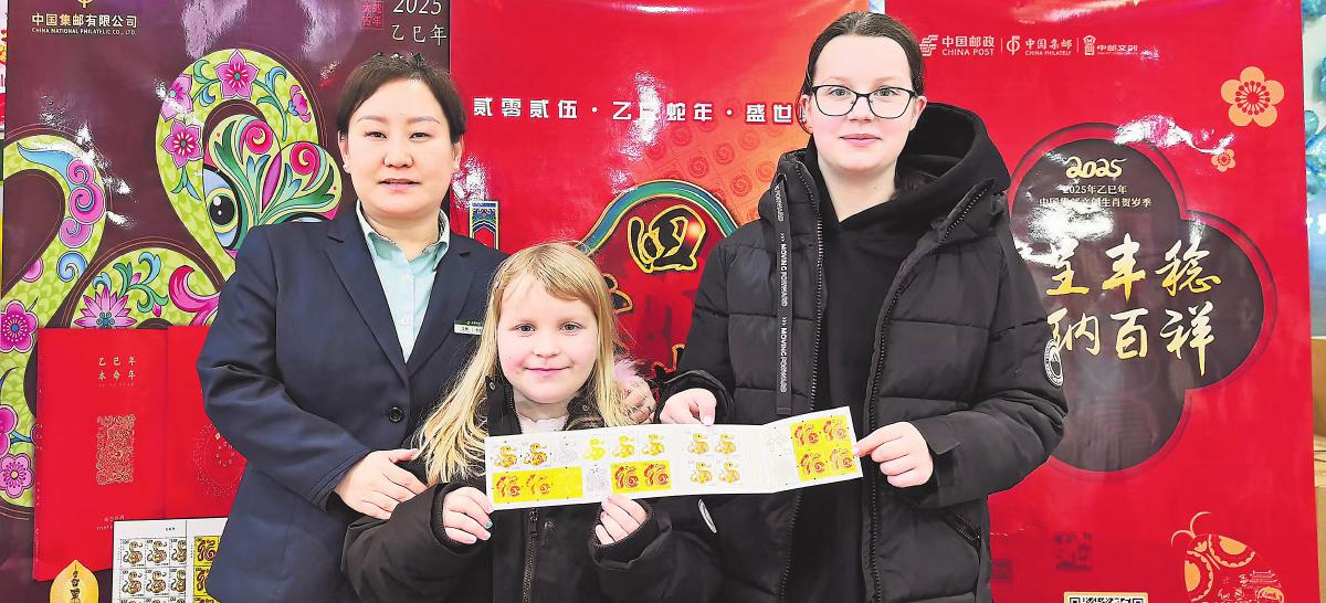 在黑龍江省雞西市郵政分公司郵電大廈營業(yè)所的生肖蛇票首發(fā)現(xiàn)場,來自俄羅斯的一家四口購買蛇年郵票和明信片并郵寄給遠(yuǎn)在故鄉(xiāng)的家人。營業(yè)人員與可愛的俄羅斯小朋友合影留念。□盧明琴 攝