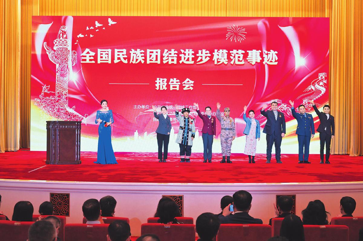 12月27日下午,由中央統(tǒng)戰(zhàn)部、黨和國(guó)家功勛榮譽(yù)表彰工作委員會(huì)辦公室、國(guó)家民委聯(lián)合舉辦的全國(guó)民族團(tuán)結(jié)進(jìn)步模范事跡報(bào)告會(huì)在北京人民大會(huì)堂舉行。包括桑南才在內(nèi)的8名全國(guó)民族團(tuán)結(jié)進(jìn)步模范集體和模范個(gè)人代表聚焦學(xué)習(xí)貫徹全國(guó)民族團(tuán)結(jié)進(jìn)步表彰大會(huì)精神,生動(dòng)講述圍繞鑄牢中華民族共同體意識(shí)主線團(tuán)結(jié)奮進(jìn)的感人故事。身著傈僳族盛裝的桑南才作為模范個(gè)人代表第一個(gè)登臺(tái)。