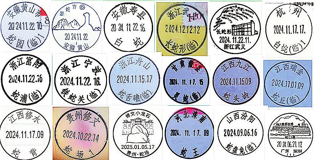 蛇年即將來臨之際,各地郵政臨時(shí)啟用的部分含“蛇”字臨戳、風(fēng)景戳。