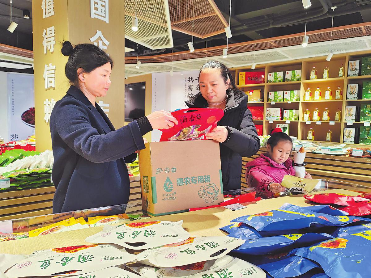 正月初二的千島農(nóng)品旗艦店人頭攢動(dòng),因其緊鄰千島湖鎮(zhèn)中心湖區(qū)旅游碼頭,優(yōu)越的地理位置加上郵政央企品牌的加持,成了春節(jié)期間游客購買旅游特產(chǎn)的不二之選。