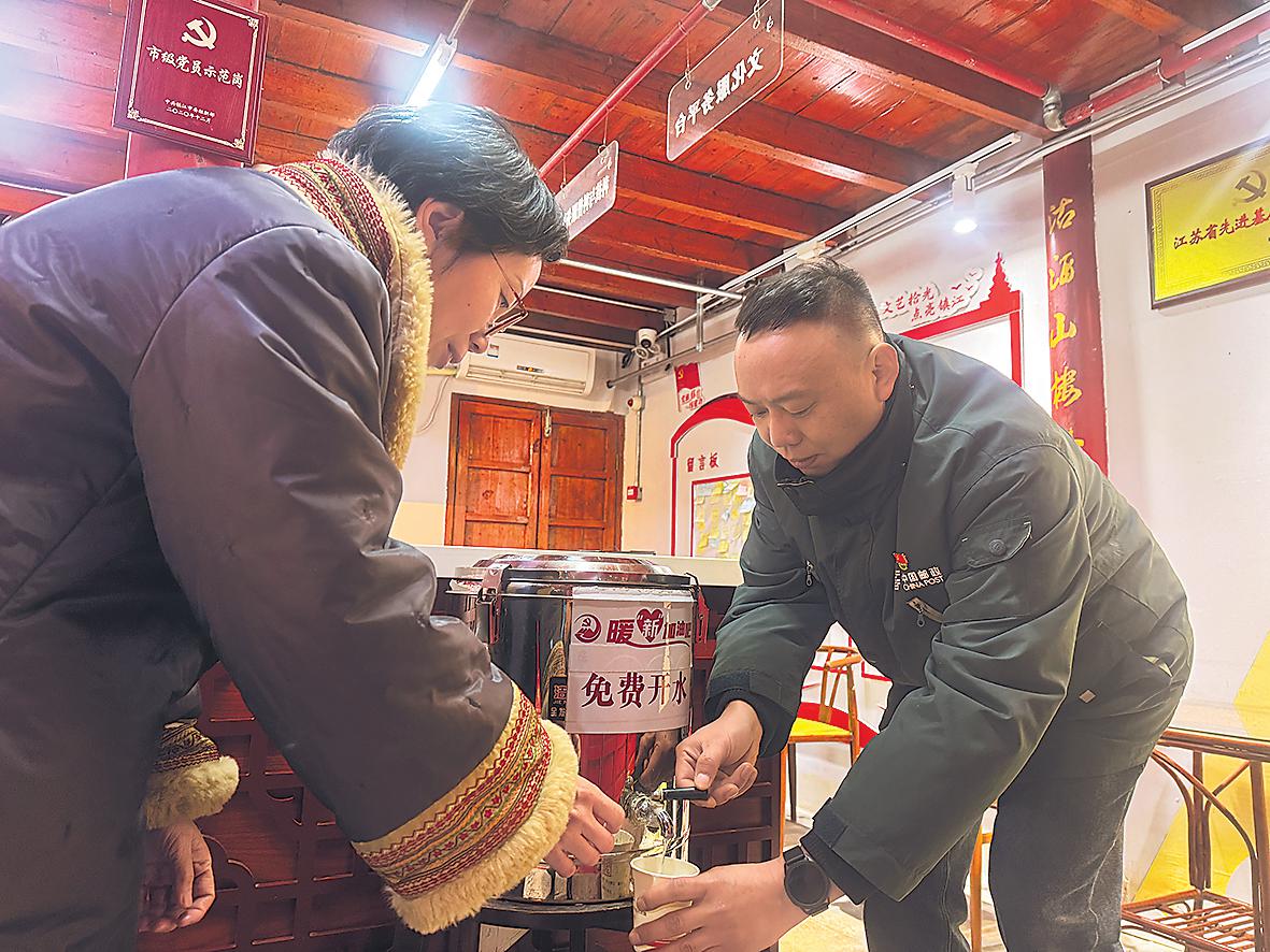 鎮(zhèn)江郵政黨員志愿者為游客提供熱水?!跏Y勁松 攝