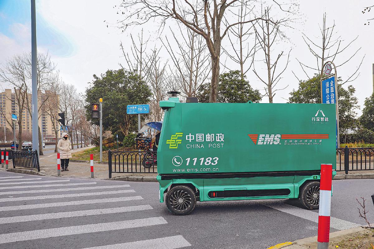 上海郵政投入的無人投遞車在道路上行駛。