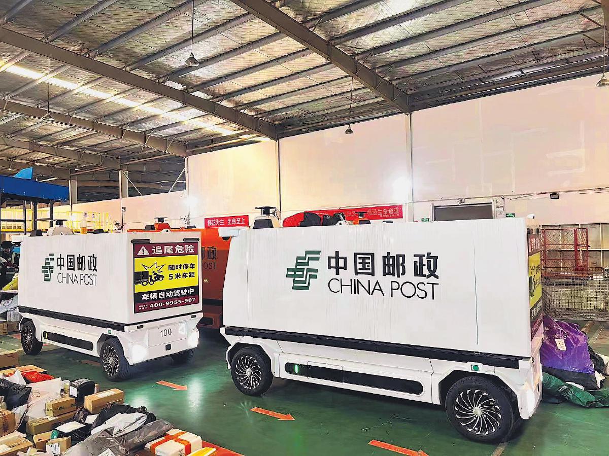 郵政無人配送車在南陵縣寄遞物流共配中心等待裝郵件?! 鯇O康 攝