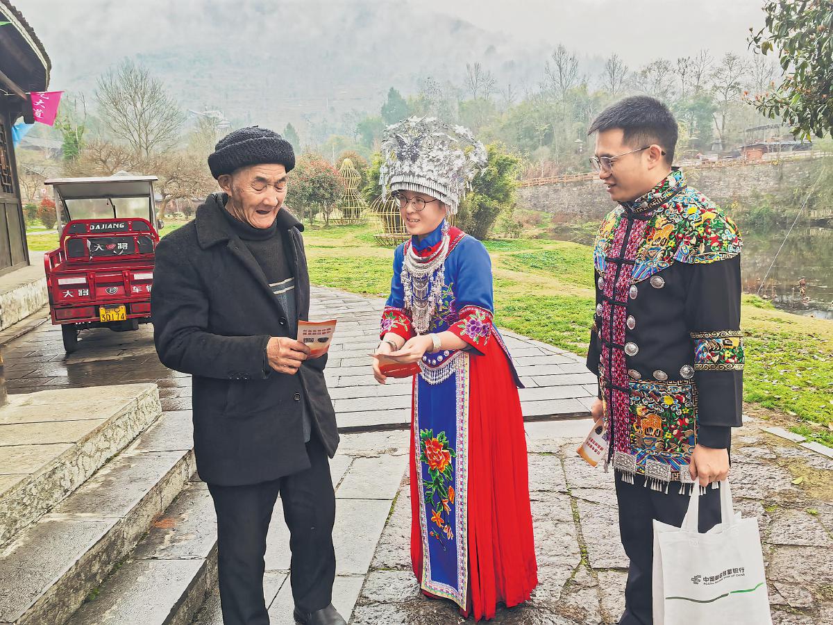 遵義市分行還利用營業(yè)網(wǎng)點遍布城鄉(xiāng)的優(yōu)勢,聯(lián)系村委會、居委會,利用鄉(xiāng)村大喇叭滾動播放宣傳提示語,提升群眾的風(fēng)險防范意識。圖為該分行員工在仡佬族聚居地開展相關(guān)宣傳活動。