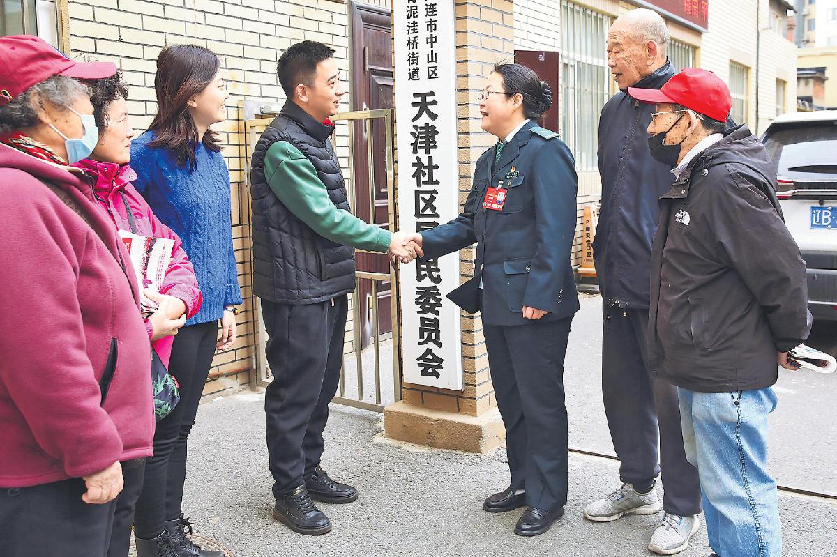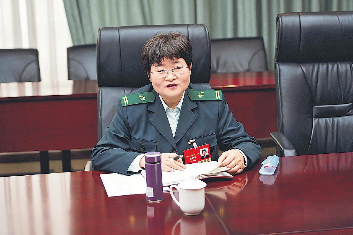 全國(guó)人大代表、遼寧省大連市中山區(qū)郵政分公司寄遞事業(yè)部勝利橋普郵營(yíng)業(yè)部站長(zhǎng)趙明枝第一時(shí)間來(lái)到社區(qū)進(jìn)行走訪,并向居民宣講全國(guó)兩會(huì)精神,與大家分享參會(huì)體會(huì)?! 蹩嚎〗堋悦鳌z