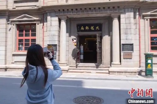 2025年4月,游客在煙臺(tái)大龍郵局建筑前拍照。曲正揚(yáng) 攝