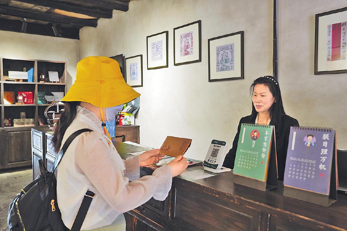 在郵政歷史陳列區(qū),一件件老物件呈現(xiàn)了中國郵政的發(fā)展脈絡(luò)。文創(chuàng)區(qū)木制展架上,“三國英雄”主題明信片、古鎮(zhèn)風(fēng)景冰箱貼等各類文創(chuàng)產(chǎn)品琳瑯滿目。為將郵政服務(wù)與茶文化深度融合,羊樓洞郵局開發(fā)了《萬里尋茶道 赤壁借東風(fēng)》明信片,游客掃碼可觀看赤壁青磚茶文化和三國歷史故事;特制的郵票茶磚將《三國演義》系列郵票融入赤壁青磚茶制作工藝,透出濃濃的歷史韻味,吸引游客駐足觀賞、挑選購買。