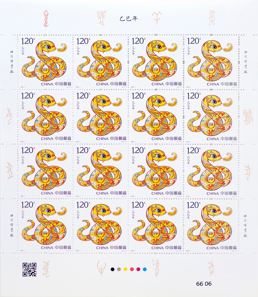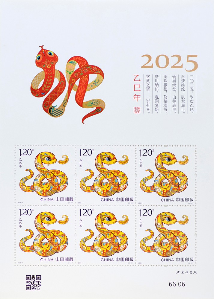 注:同時發(fā)行《乙巳年》郵票版式三(整張枚數(shù):2套4枚;整張規(guī)格:120×160毫米;對聯(lián)作者:常江)。計劃發(fā)行數(shù)量:414萬版。用于贈送給預訂2025年全年紀特郵票的預訂戶。