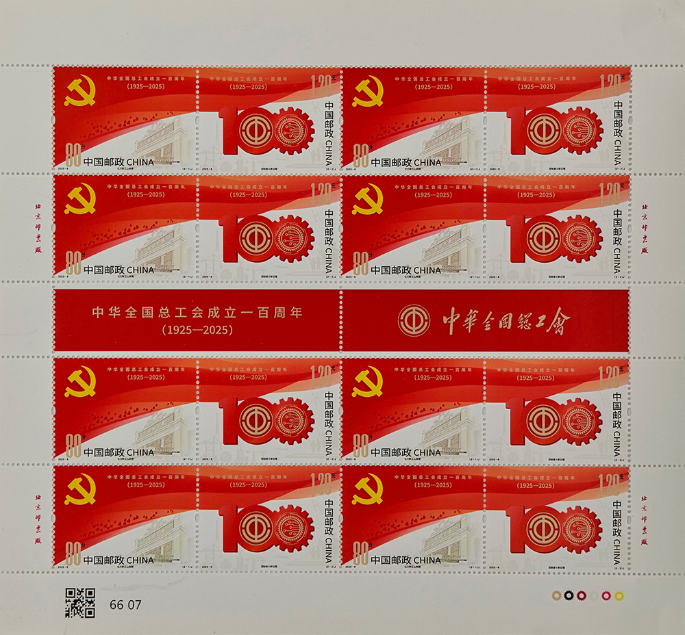 中國(guó)郵政定于2025年5月1日發(fā)行《中華全國(guó)總工會(huì)成立一百周年》紀(jì)念郵票1套2枚。詳情如下:
